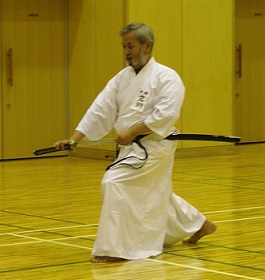 子供の頃からチャンバラ好きでした。 私の年代の男の子はほとんどそうでしょうが、東映の時代劇に夢中になり、 風呂敷で覆面をして鞍馬天狗になったり、二刀流で宮本武蔵になったり、 「赤城の山も今宵がかぎり」なんてセリフを覚えて得意になっていました。 高校時代の剣道部の先輩で懇意にしている方から ある日「十思スクエアで居合をやってる入ろうか」と誘われました。 でも月謝があまり高かったらよそう、と野口先生の元をお訪ねしました。 ところが先生は「月謝はいただきません。 ただ、道場(体育館)の使用料等多少の経費がかかるので、 そのための会費は頂きます」との事で即入門をお願いしました。 |