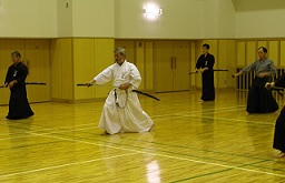 入門してみると様々な人達がいました。現役の学生さんから、 定年間近のおじさんまで。女性も何人かいて華やかでした。 指導してくださる方々も師範の野口八段、会長の鈴木七段を始め、 五・六段の先生方が、懇切丁寧に教えて下さいました。 もちろん「武道」ですから技(業)のみならず仁義礼節にいたるまで 基本からきちんと教授していただき、 一級、初段、二段とトントン拍子に進みました。 そうなると稽古も面白くなり、気が付いたらもう入門九年もたっています。 「居合の魅力」は何か?とよく聞かれますが、 私の場合は稽古の始まる前、正面に礼をし、 刀に礼をして腰に刀を帯びる時の一瞬、 臍下丹田に力を込めた時の緊張感が、身の引き締まる思いがします。 |